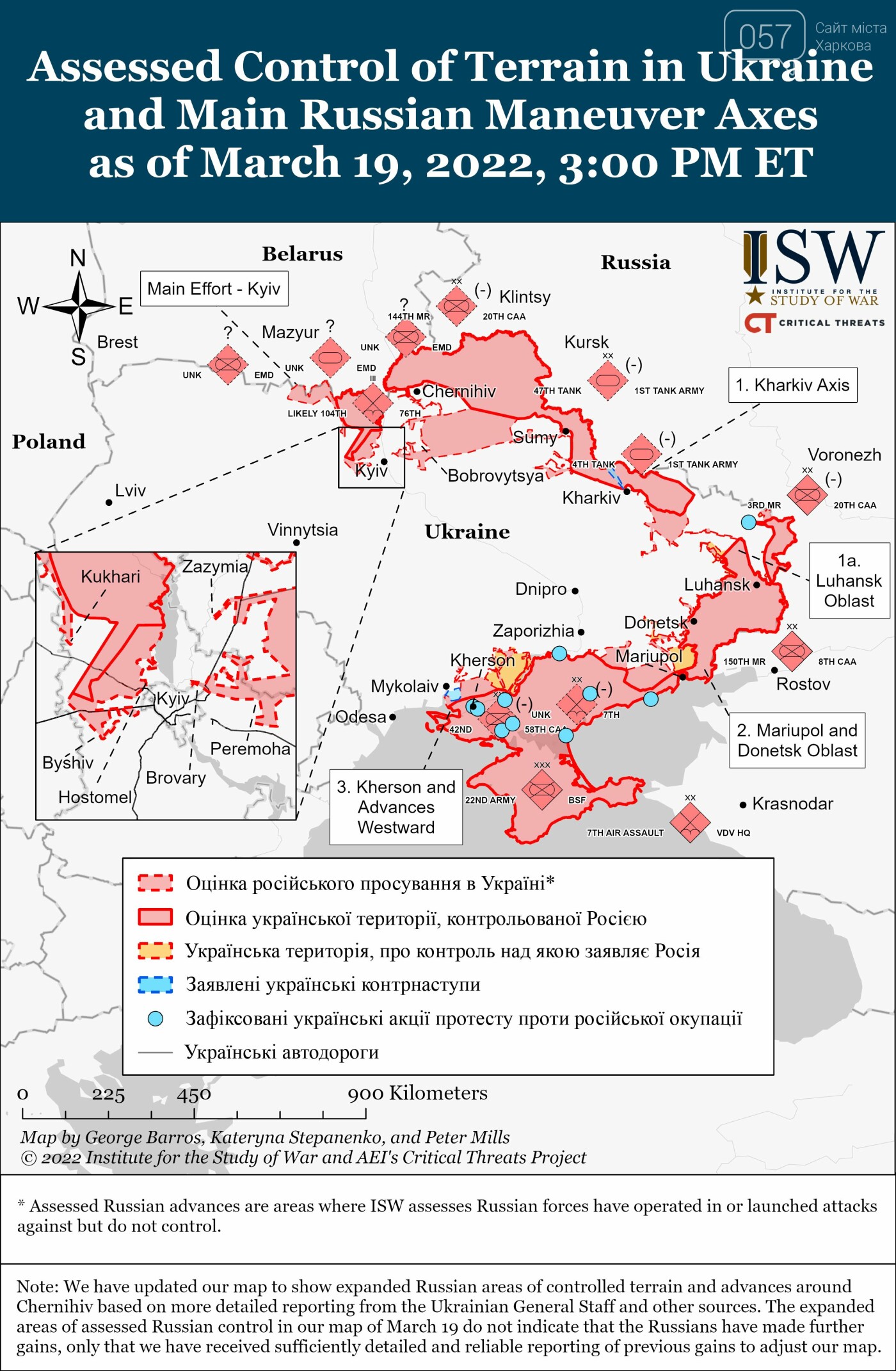 Несмотря на яростное сопротивление военных, добровольцев и гражданского населения, по состоянию на март 2022 года, российские войска контролировали около 167 000 – 170 000 км² украинской территории с общей площади Украины, то есть примерно 27–28 % территории Украины.