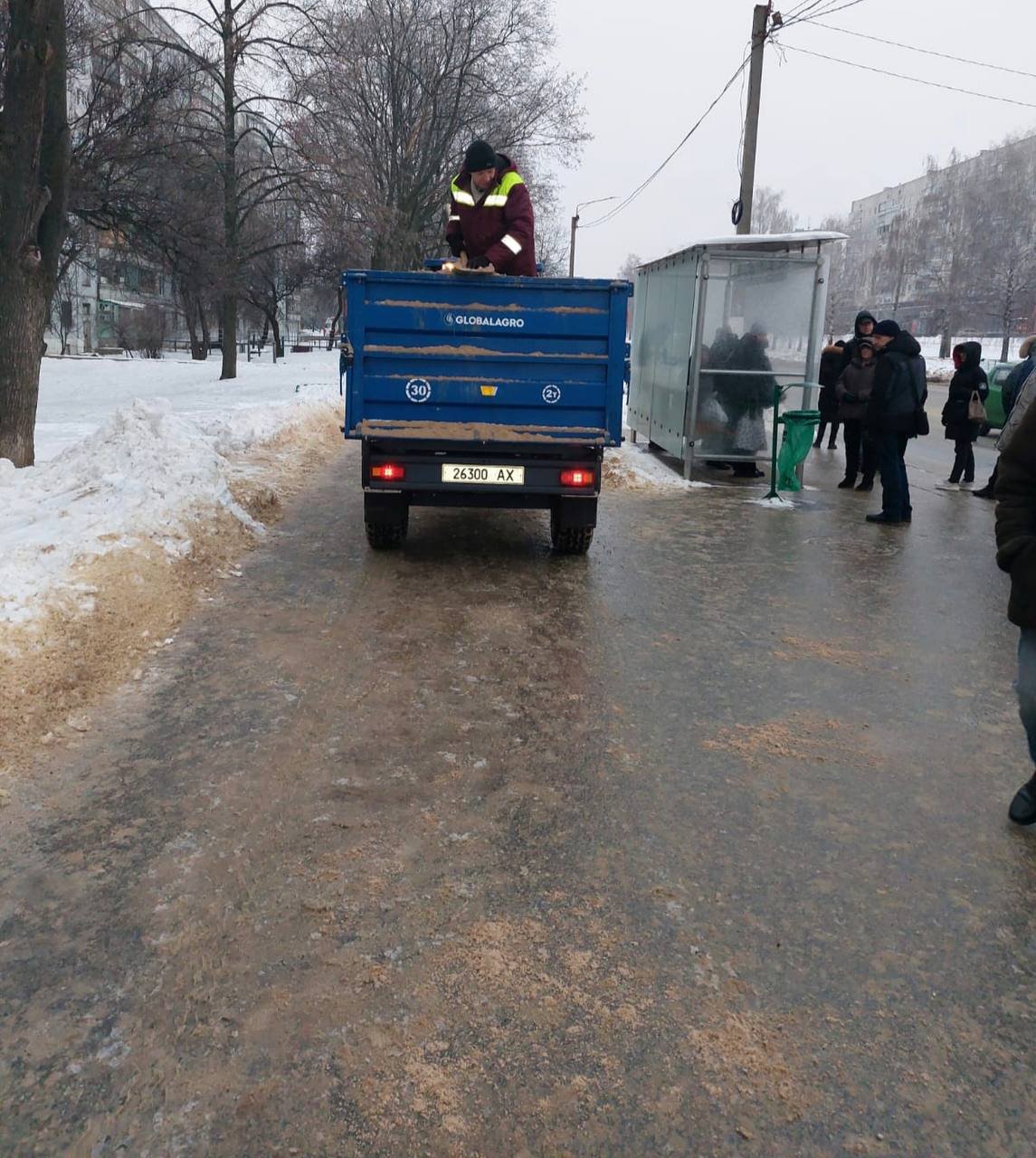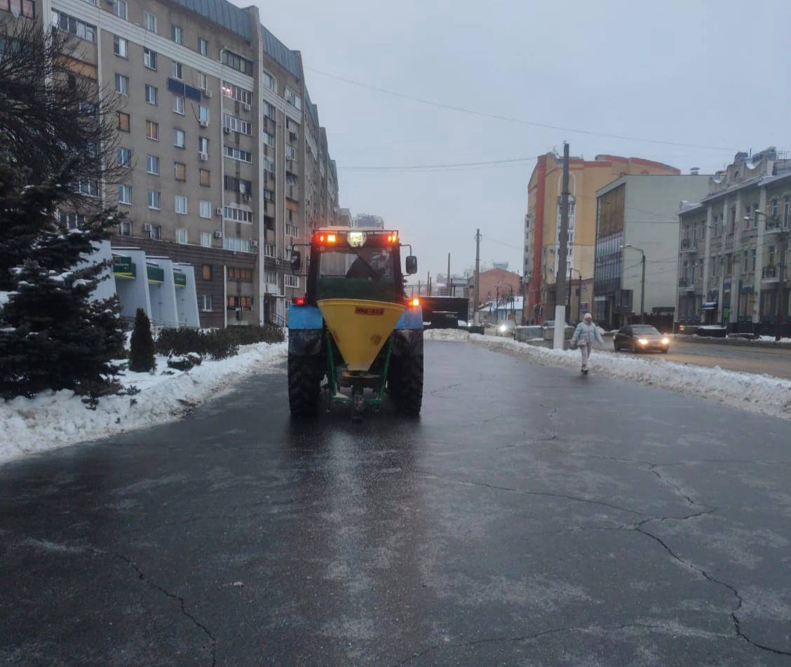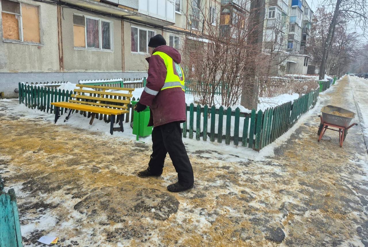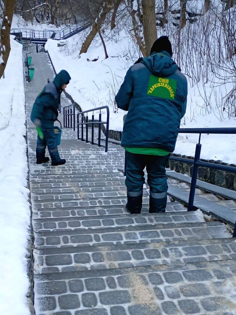 В Харькове утром коммунальщики посыпают песчано-солевой смесью придомовые территории, пешеходную и проезжую части, остановки и входы в метро. Привлечены работники разных коммунальных предприятий.