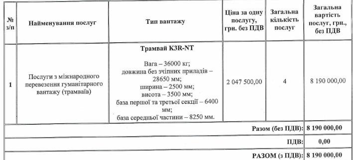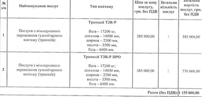 Однако это соглашение было реализовано частично. Подрядчик – ЧП "Транс авто Д" перевез только один трамвай. Стоимость транспортировки 36-тонного трамвая составила 2,04 млн. грн.