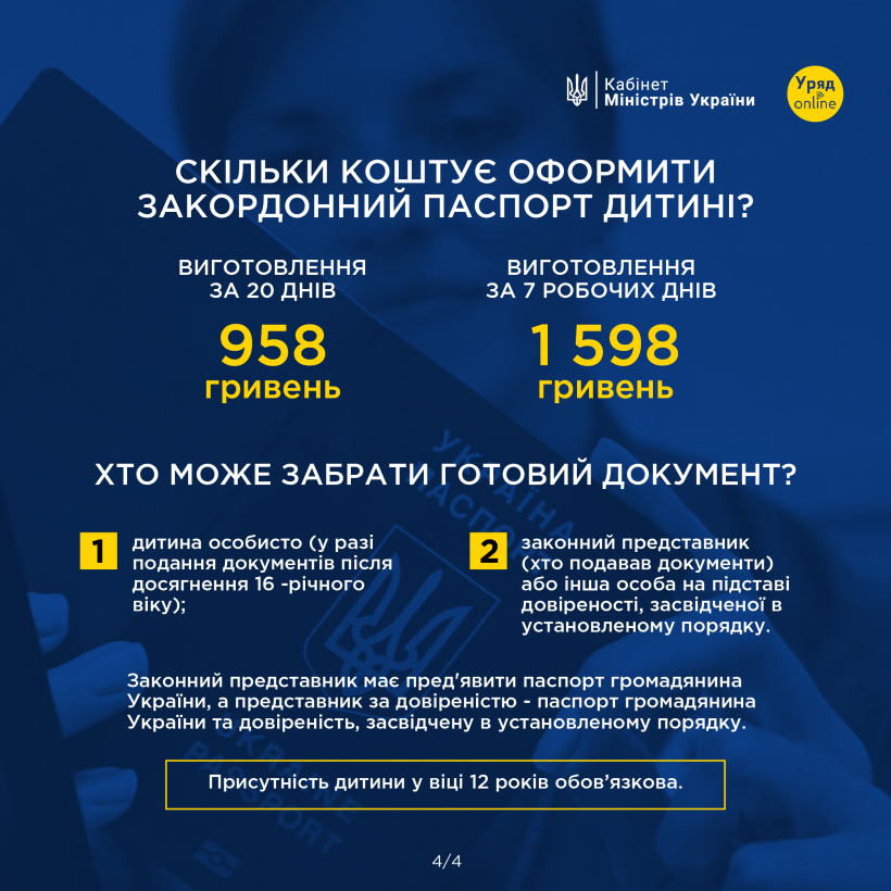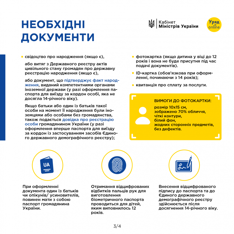 Если ребенок не достиг 12-летнего возраста, его личное присутствие не обязательно. Для этого могут быть предоставлены фотографии ребенка, отвечающие установленным требованиям. При оформлении документа один из родителей или опекунов/усыновителей должен иметь с собой паспорт гражданина Украины.