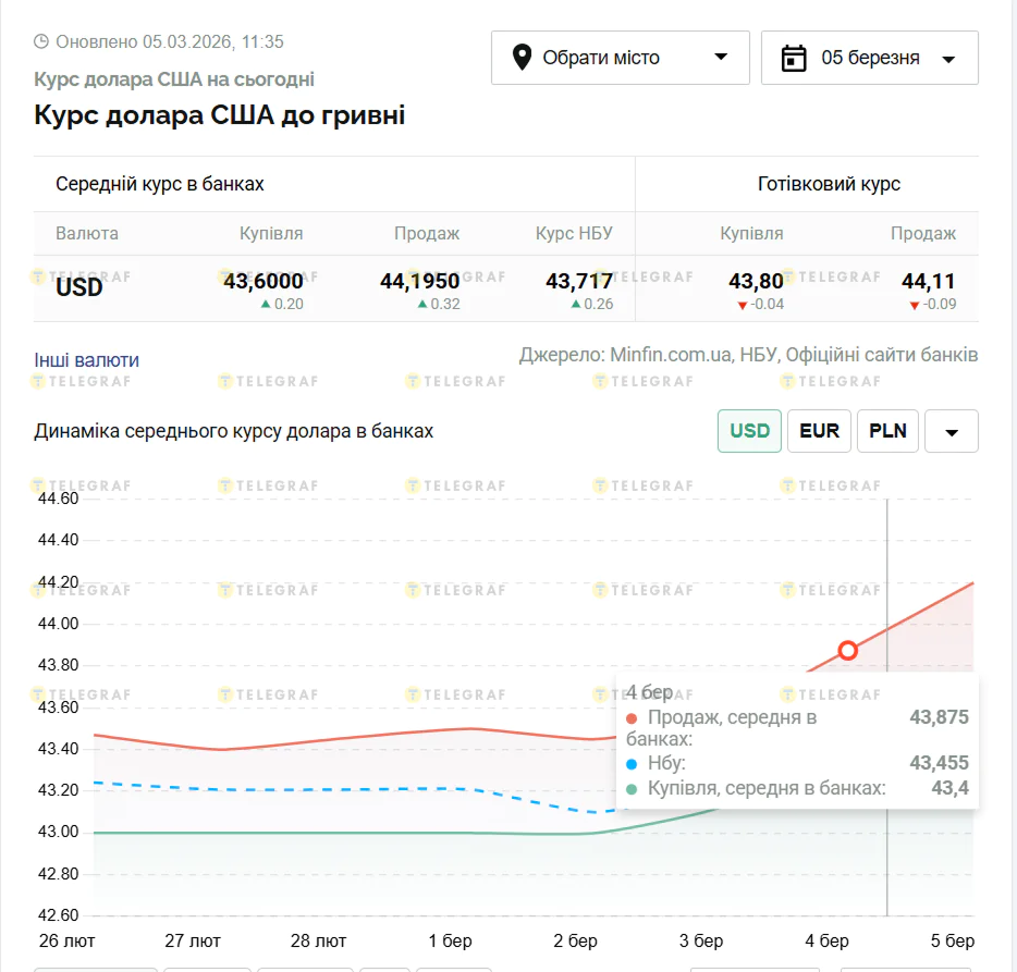 По данным Национального банка, официальный курс в первые дни марта поднялся до примерно 43,7–43,8 грн за доллар , что стало новым историческим максимумом. Сегодня американская валюта в обменках на продажи превысила отметку в 44 гривны.