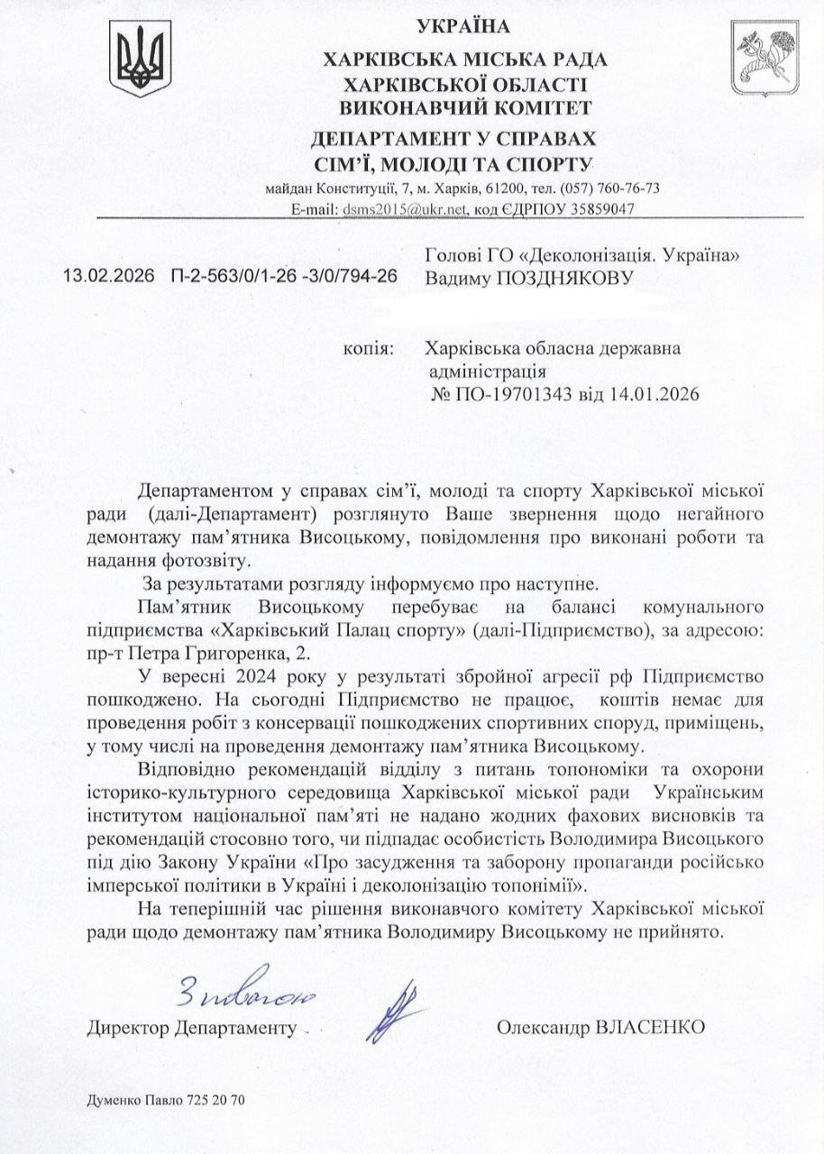 На запрос главы общественной организации Вадима Позднякова в Харьковском горсовете ответили, что памятник стоит на балансе Дворца спорта, разрушенного в результате российских обстрелов. Поэтому средств на снос монумента нет. К тому же, в горсовете ссылаются на то, что Украинский институт национальной памяти до сих пор не предоставил рекомендаций относительно того, подпадает ли фигура Высоцкого под закон о деколонизации.