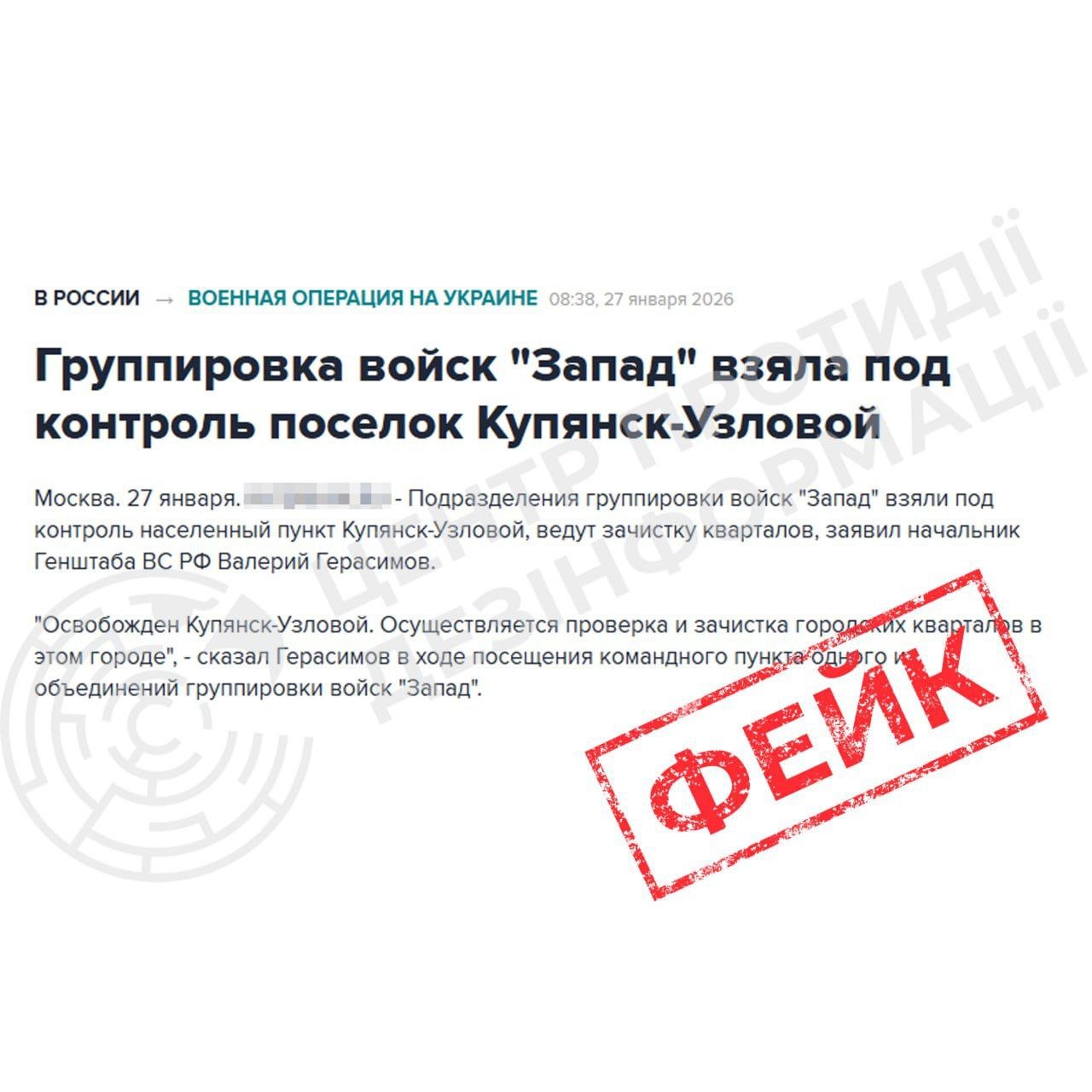 Фейковые заявления публично распространяет начальник генерального штаба России валерий герасимов. На самом же деле ни Купянск, ни Купянск-Узловой не находятся под контролем российских войск.