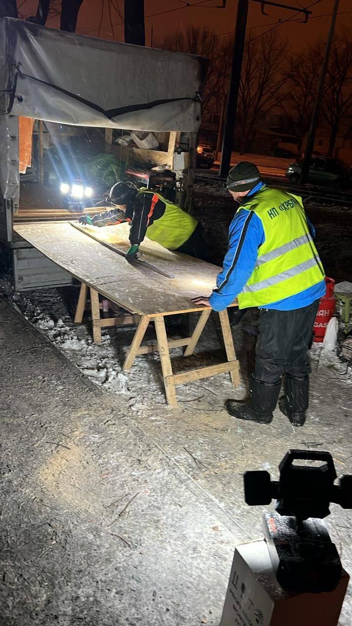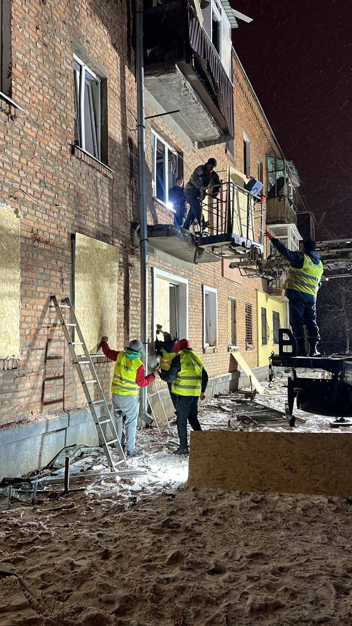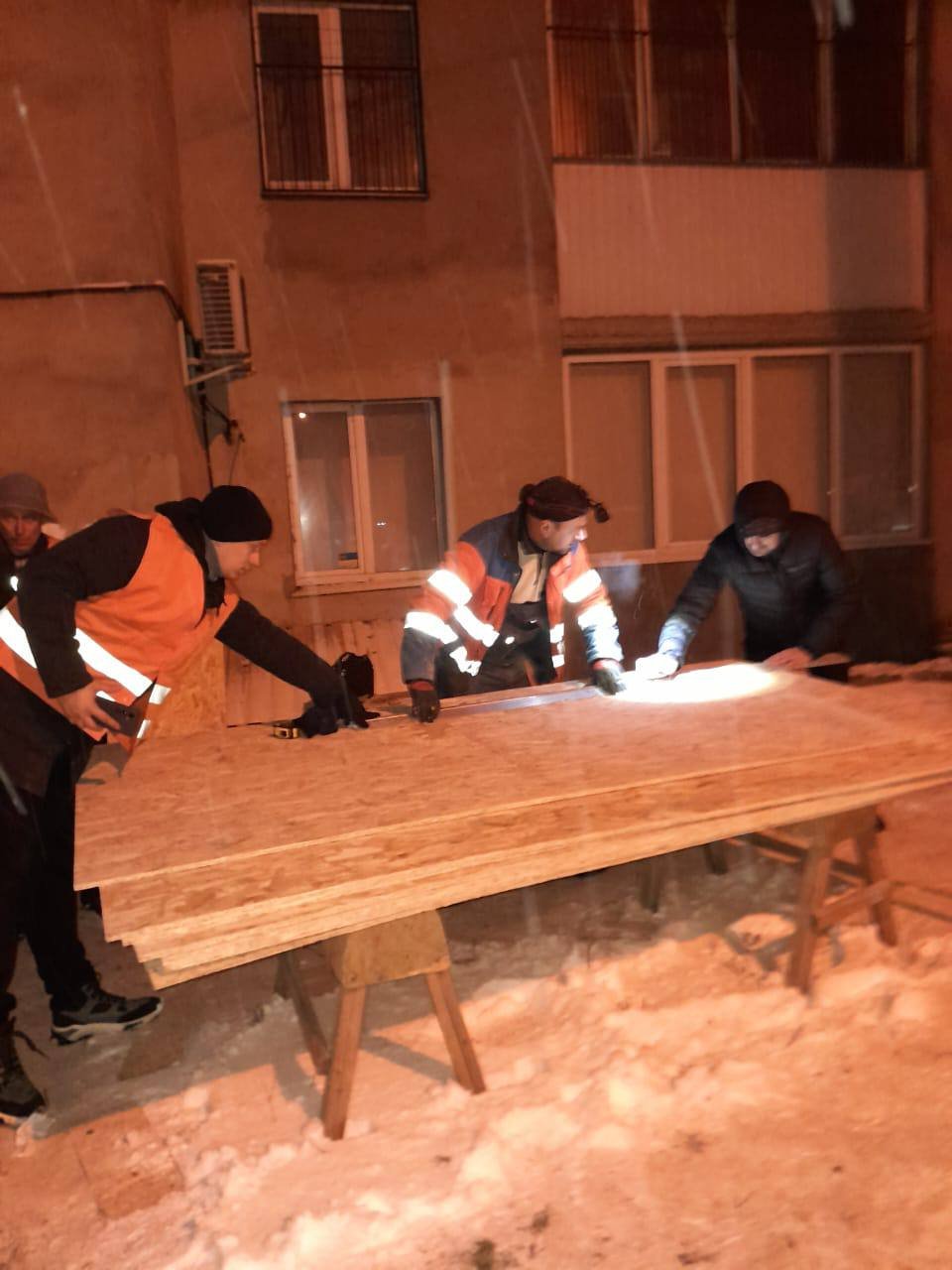 Специалисты КП «Харьковжилстрой» и КП «Харьковское ремонтно-строительное предприятие» устраняют последствия взрыва, закрывают выбитые контуры домов.