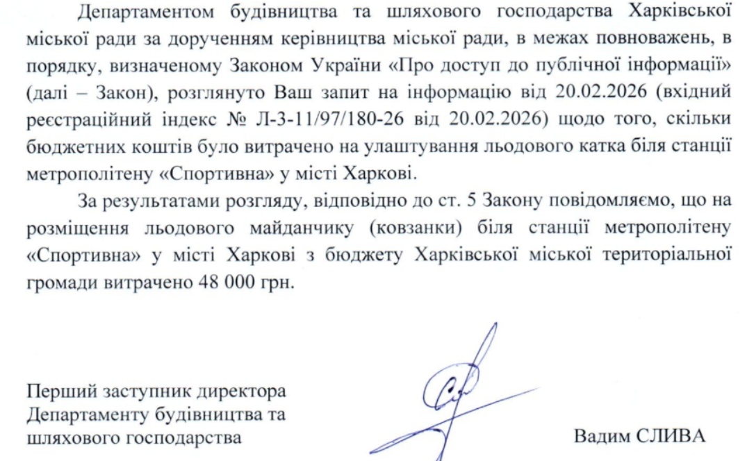 "На размещение ледовой площадки (катка) возле станции метро "Спортивная" в городе Харькове из бюджета Харьковской городской территориальной громады израсходовано 48 тысяч гривен", говорится в ответе первого заместителя Департамента строительства и дорожного хозяйства Вадима Сливы.