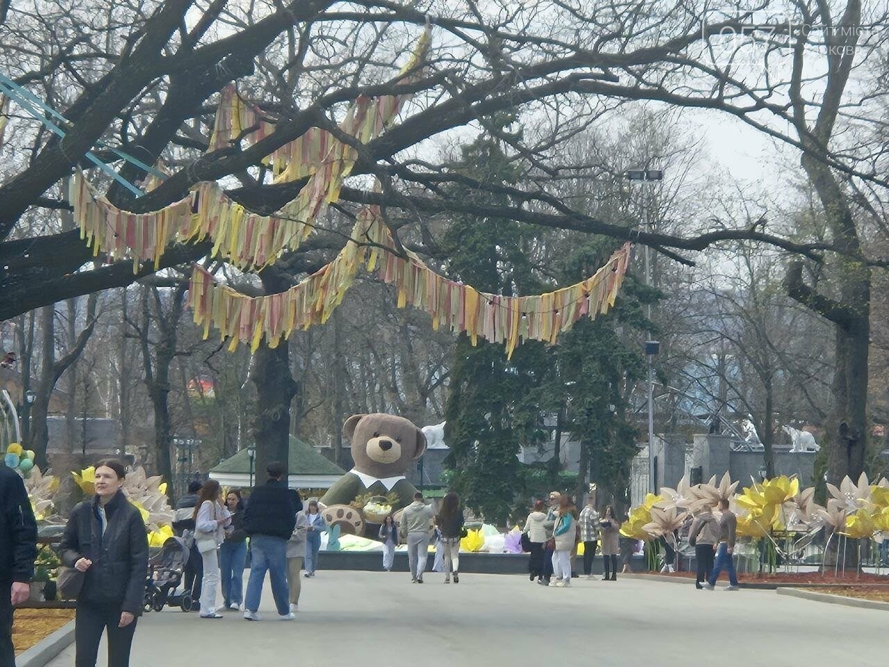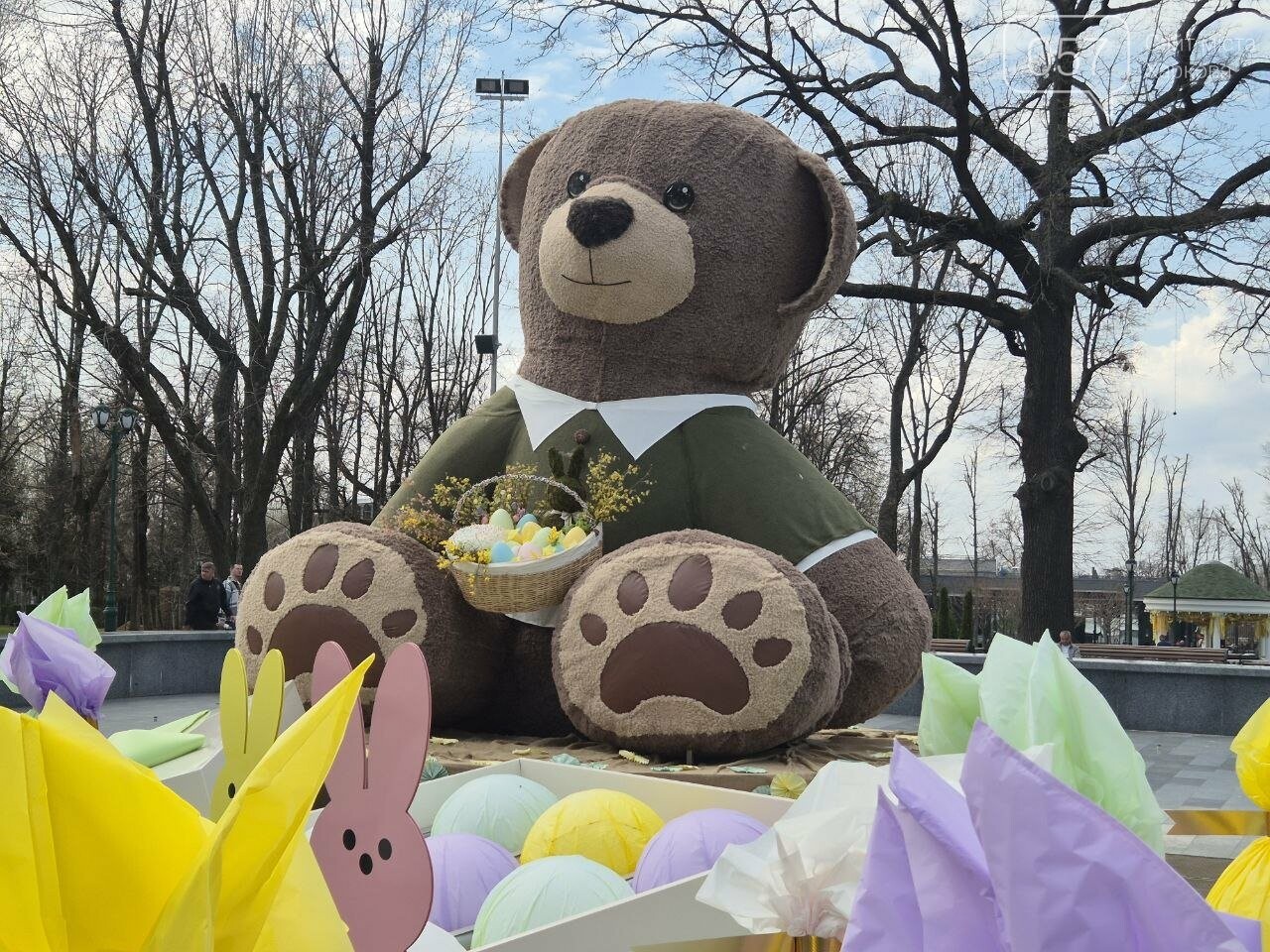 Особое внимание также привлекает гигантский мягкий медведь, установленный в саду Шевченко на месте центрального фонтана — именно там сейчас собирается больше всего людей.