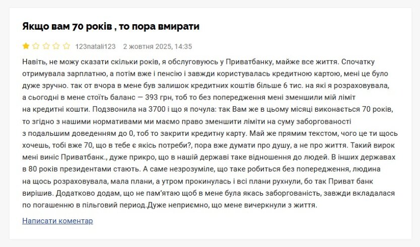 Очередная клиентская жалоба на работу ПриватБанка вызвала резонанс в социальных сетях. На этот раз речь идет о практике резкого ограничения кредитных лимитов для клиентов пожилого возраста без предварительного уведомления.