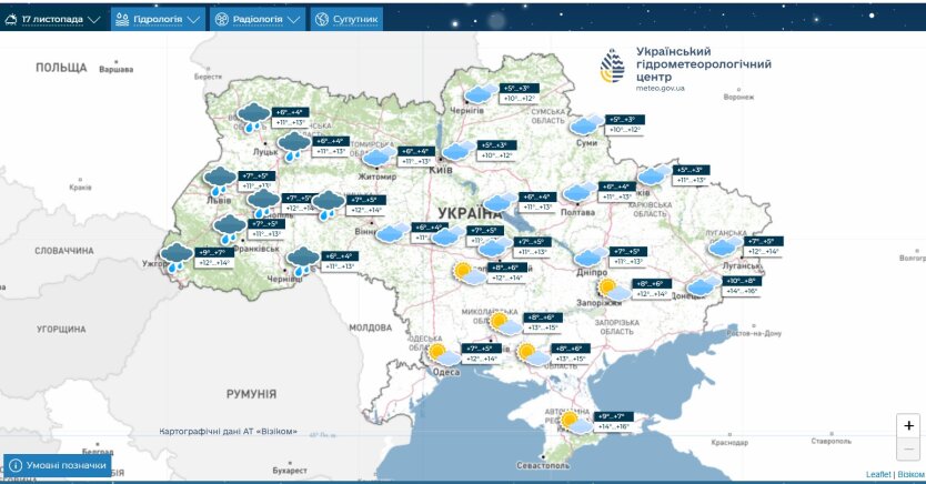 В понедельник, 17 ноября, небо над Украиной затянет облаками. Дожди пройдут преимущественно в западных регионах, тогда как в южных и большинстве центральных областей будет умеренная облачность.