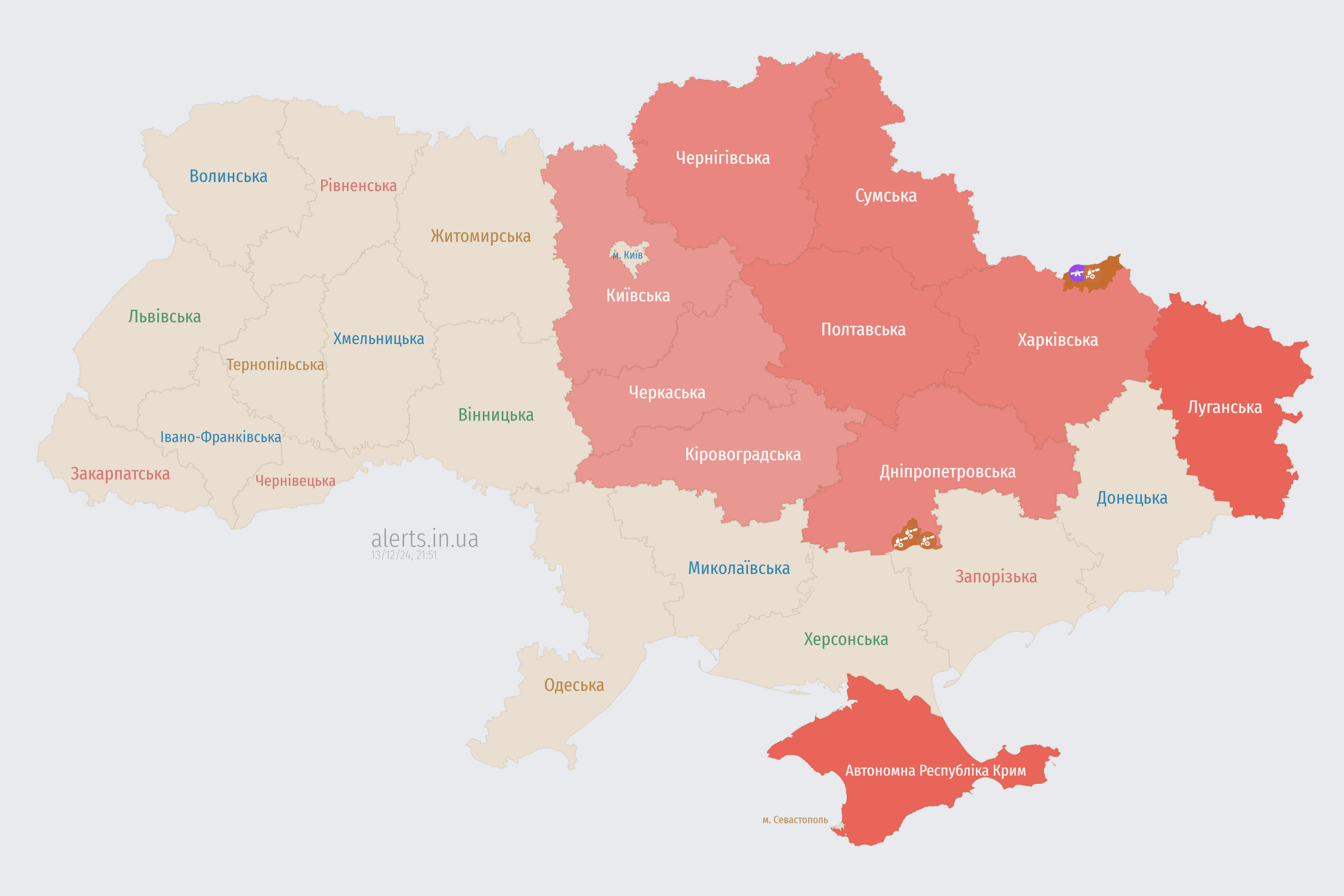 Российские оккупанты вечером 13 декабря снова запустили по Украине дроны-камикадзе "Шахед". Воздушную тревогу объявили уже в ряде областей.