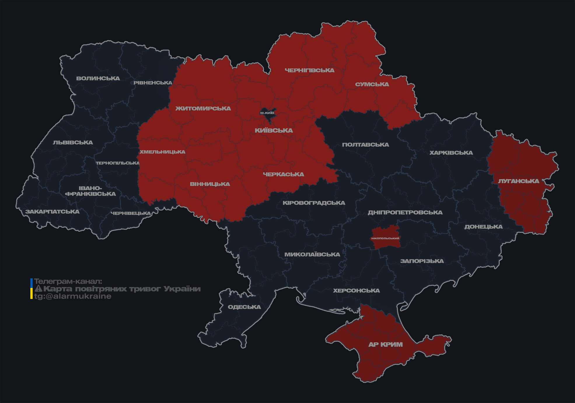 По состоянию на 01:19 карта воздушных тревог Украины выглядит так: