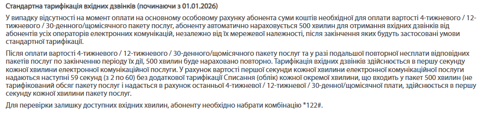 С 1 января 2026 года lifecell обновил стандартную тарификацию входящих звонков. Если абонент не оплатил пакет услуг по тарифу, то входящие звонки (когда звонят вам) будут ограничены лимитом, а когда он исчерпается — платными.