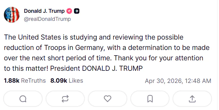 Президент США Дональд Трамп заявив, що його адміністрація розглядає можливість скорочення американського військового контингенту в Німеччині. Про це він повідомив у соцмережі Truth Social, пише УНН.